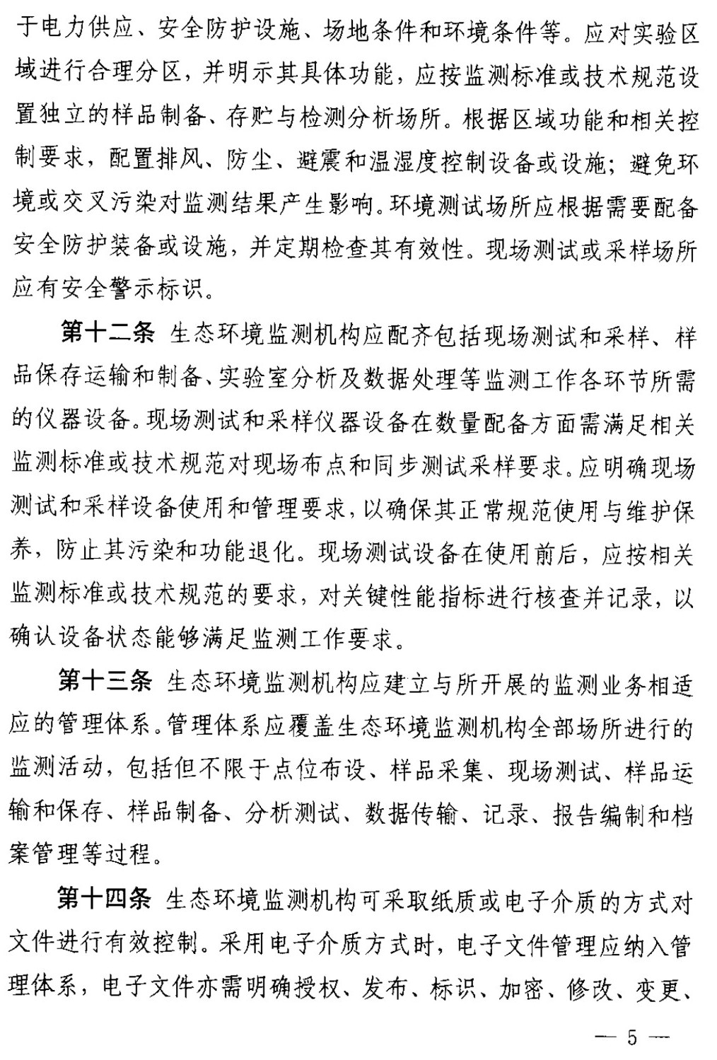 第十三條 生態(tài)環(huán)境監(jiān)測機構(gòu)應(yīng)建立與所開展的監(jiān)測業(yè)務(wù)相適應(yīng)的管理體系。管理體系應(yīng)覆蓋生態(tài)環(huán)境監(jiān)測機構(gòu)全部場所進行的監(jiān)測活動,包括但不限于點位布設(shè)、樣品采集、現(xiàn)場測試、樣品運輸和保存、樣品制備、分析測試、數(shù)據(jù)傳輸、記錄、報告編制和檔案管理等過程。